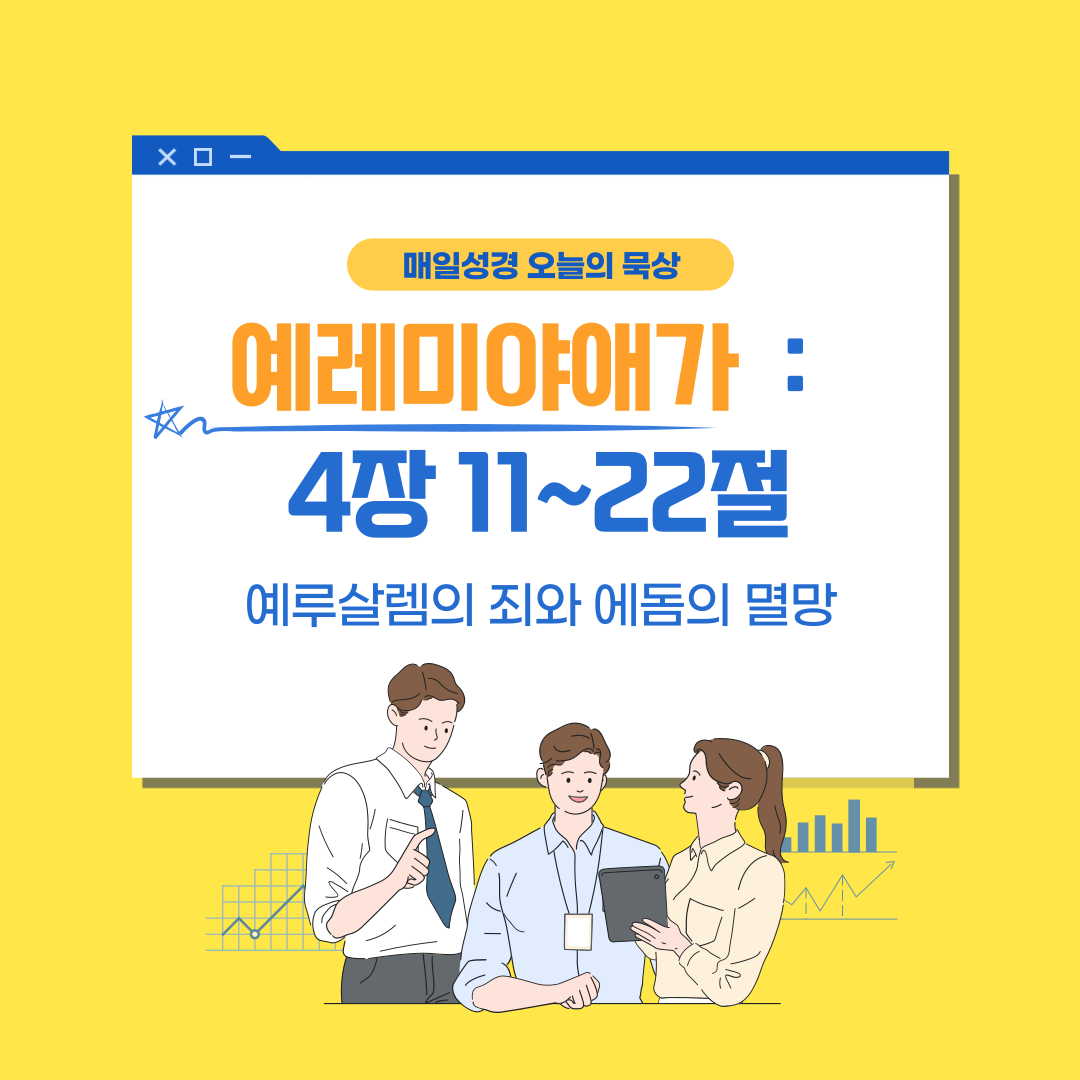 예레미야 애가 4장 11절에서 22절은 예루살렘의 몰락을 더욱 깊이 설명하면서 그 원인과 결과를 조명하고, 결국 에돔에 대한 심판과 이스라엘의 회복을 예언합니다. 예루살렘의 파괴는 하나님의 공의로운 심판으로, 그들의 죄에 대한 결과였습니다. 그러나 이 심판 속에서도 회복의 희망이 있으며, 반대로 이스라엘의 적들, 특히 에돔은 하나님께서 반드시 심판하실 것입니다.